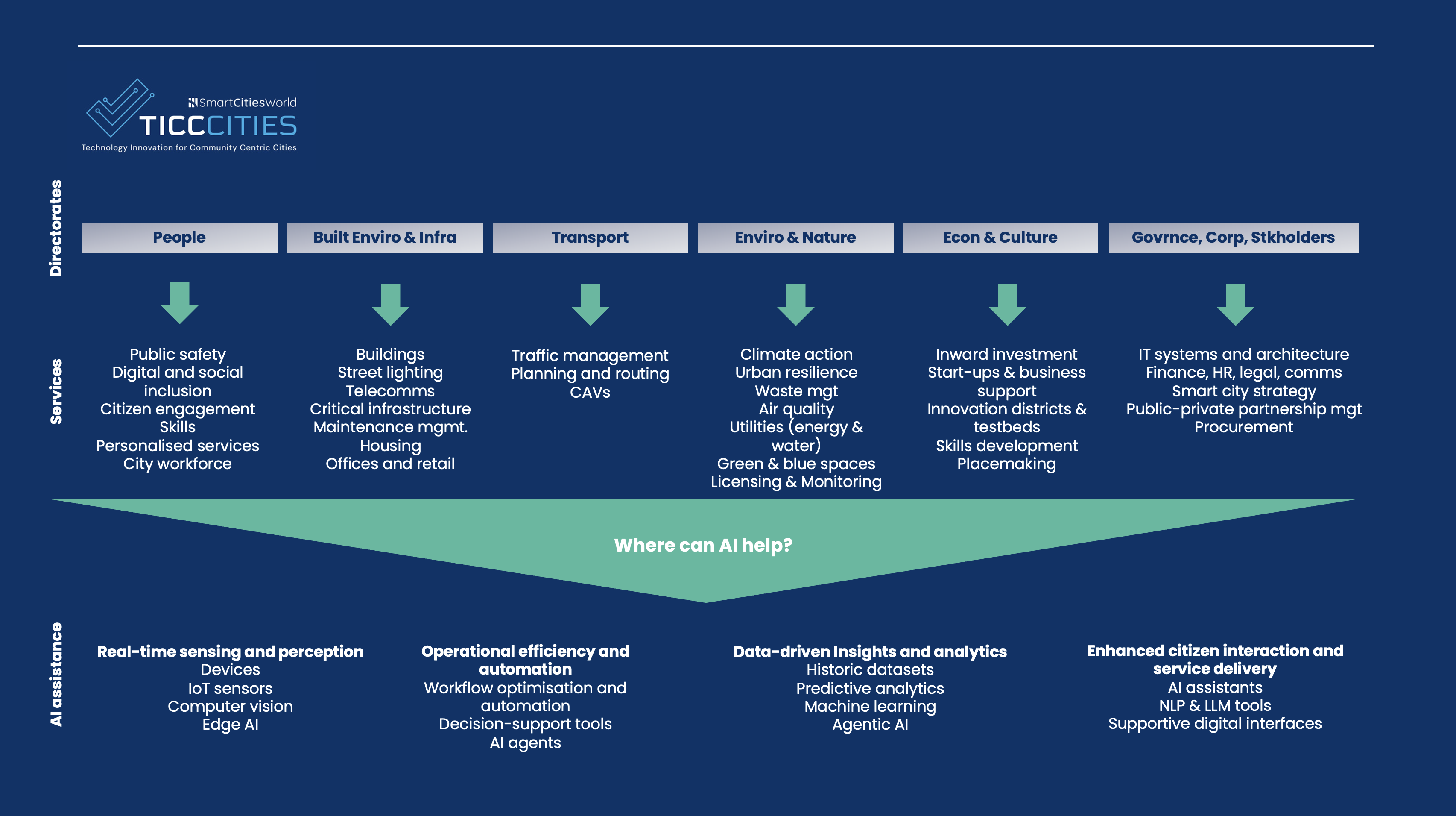 Beyond these two pillars, AI CityXchange structures its content around the core functions of a city, recognising that AI adoption is ultimately about outcomes for people, places, and public services. Coverage spans people & community; built environment & infrastructure; transport; environment & nature; economy & culture; and governance, corporate services, and stakeholder partners. Within each function, content drills down into specific services and challenges – from public safety and social services, to buildings and energy systems, traffic management and mobility, climate action and environmental monitoring, skills development and economic growth, and governance models, partnerships, and procurement approaches.