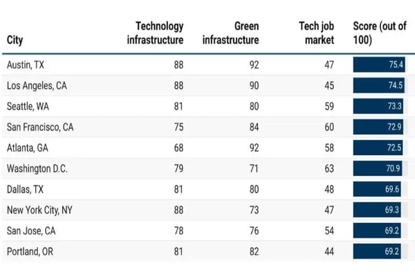 The company examined 11 indicators of a smart city, as defined by the Organisation for Economic Cooperation & Development (OECD), in the categories of tech infrastructure and connectivity; green infrastructure; and tech-driven job markets.