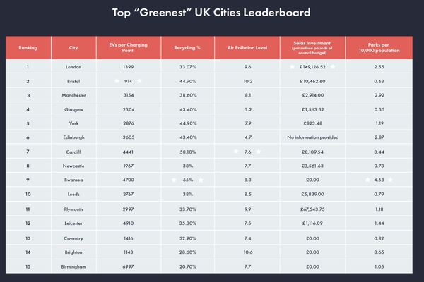 Bristol was second, with the most EV charging points for drivers, at only 914 drivers per charger. In comparison, Birmingham EV drivers had 6,997 drivers per charging station. The high percentage of household recycling, and substantial investment in solar also made it a contender.