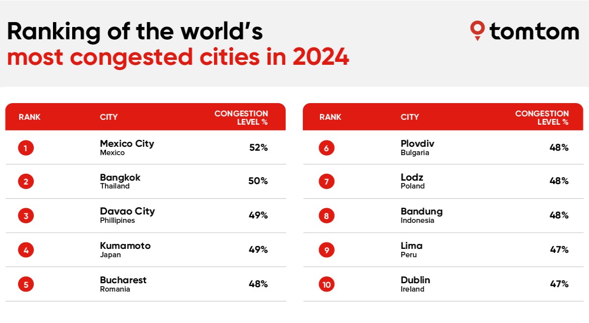 Mexico City is ranked the most congestion city in 2024 with the Thai capital Bangkok second and Davao City in the Philippines third, according to the 14th edition of its TomTom Traffic Index, which provides an overview of global traffic trends.