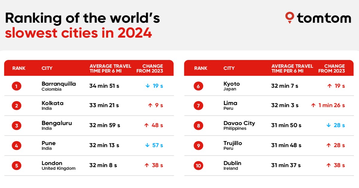 In 2024, Barranquilla in Colombia was the city with the lowest average speed. The average speed over the year is 10.3 mph, which means that it takes almost 35 minutes on average to complete a simple six-mile journey. Three Indian cities feature in the top five list of slowest cities. London, the first European city in the ranking, is in fifth position, with an average speed of 11.2 mph in the city. Yet the English capital is only 150th in the congestion ranking, which measures only the dynamic factors of slow speed.