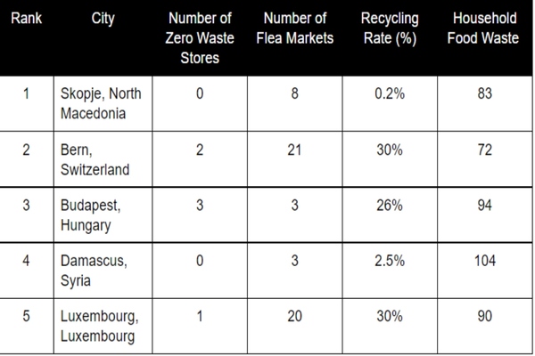 Savoo was able to determine which cities rank worst for moving towards zero waste and reports that the city of Skopje in North Macedonia comes first, with no zero-waste stores available at the time of the analysis and just eight flea markets open. It has a recycling rate of less than one per cent (0.2 per cent).